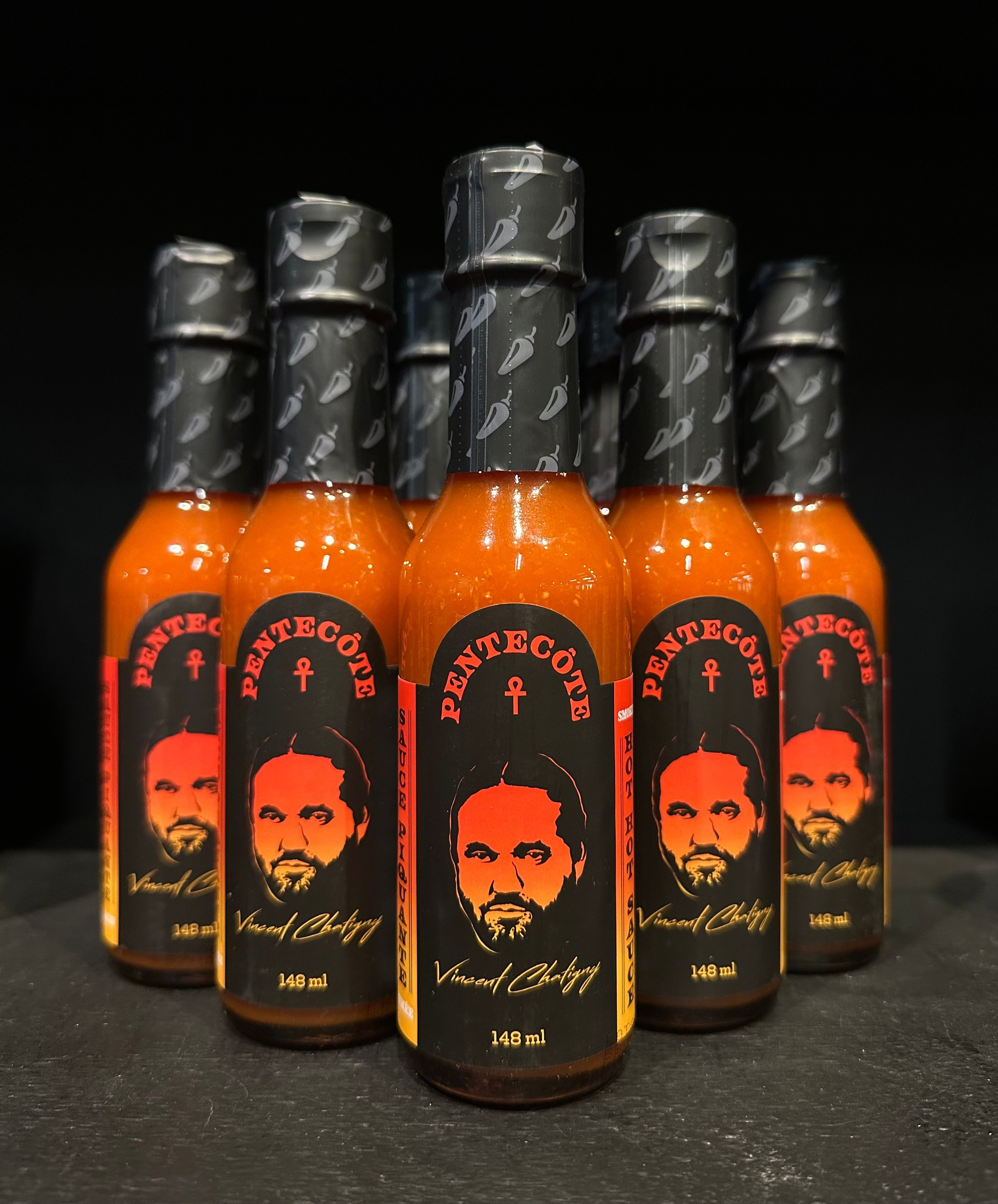 La sauce piquante PENTECÔTE est composée d'ingrédients actifs tels que des piments Habaneros, de l'ail et du gingembre fumé, et du vinaigre de vin blanc de première qualité. Une formule 100 % éprouvée et « HARD HITTING » qui réunit alchimie ésotérique et savoir-faire culinaire. La dominance des ténèbres dont l'ouvrage est compris des seuls initiés.